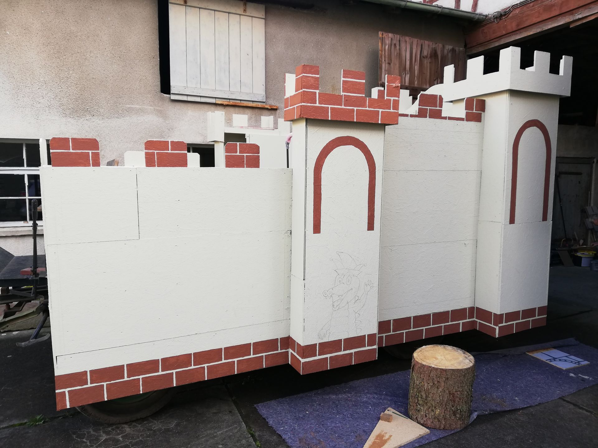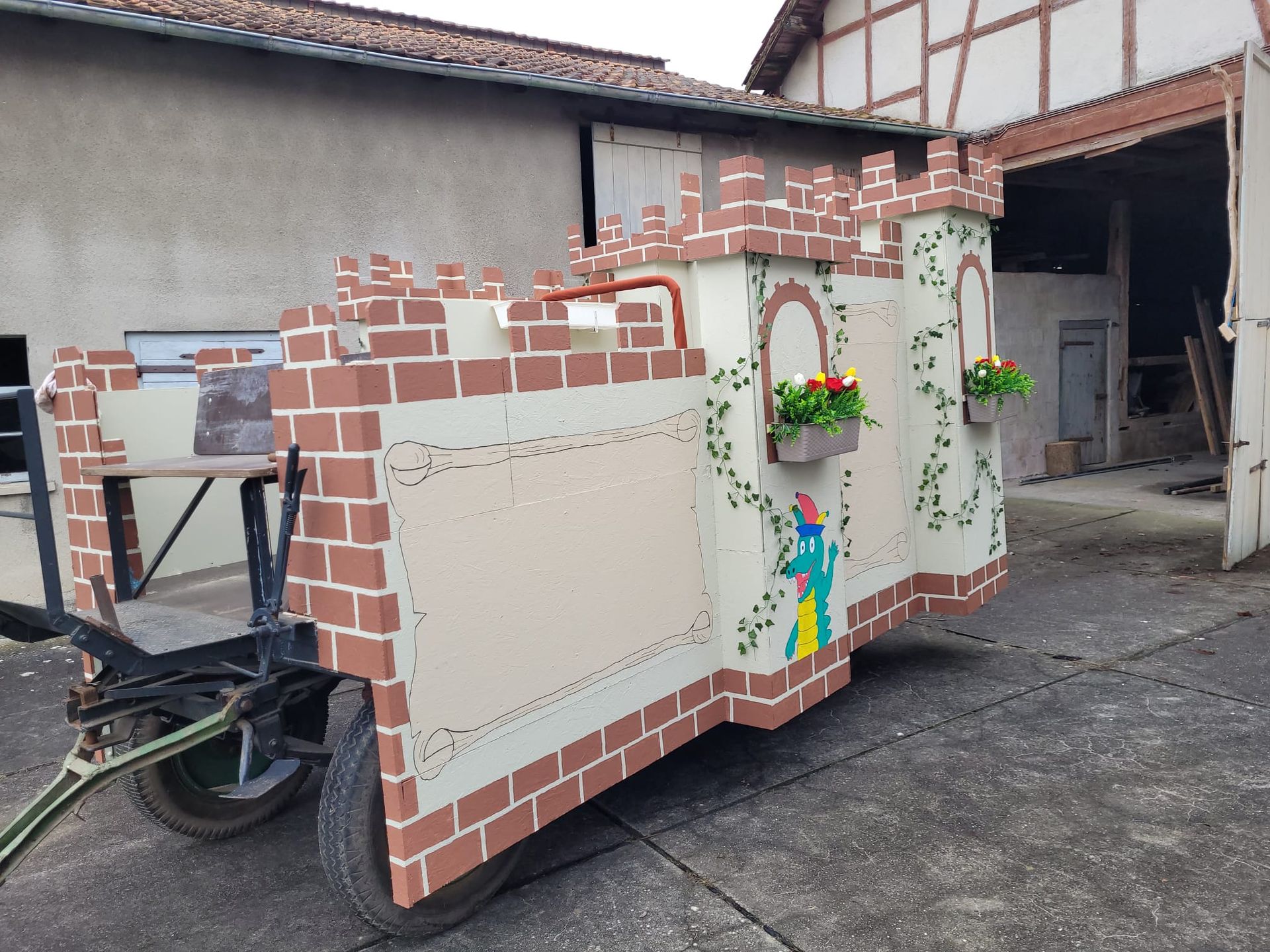 Nach der gemeinsamen Ideenfindung wurde sich darauf geeinigt, die närrischen Tollitäten in den nächsten Jahren standesgemäß auf einer Burg zu präsentieren. Die Vereinsmitglieder haben geplant, gezeichnet, getüftelt und gebaut, bis die Burg ihre finale Gestalt angenommen hat.